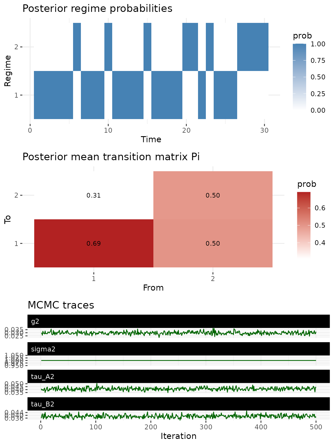 The summary reports the posterior mean transition matrix and variance parameters. The diagonal of indicates regime persistence: values near 1 mean regimes tend to stick, while large off-diagonal values indicate frequent switching.