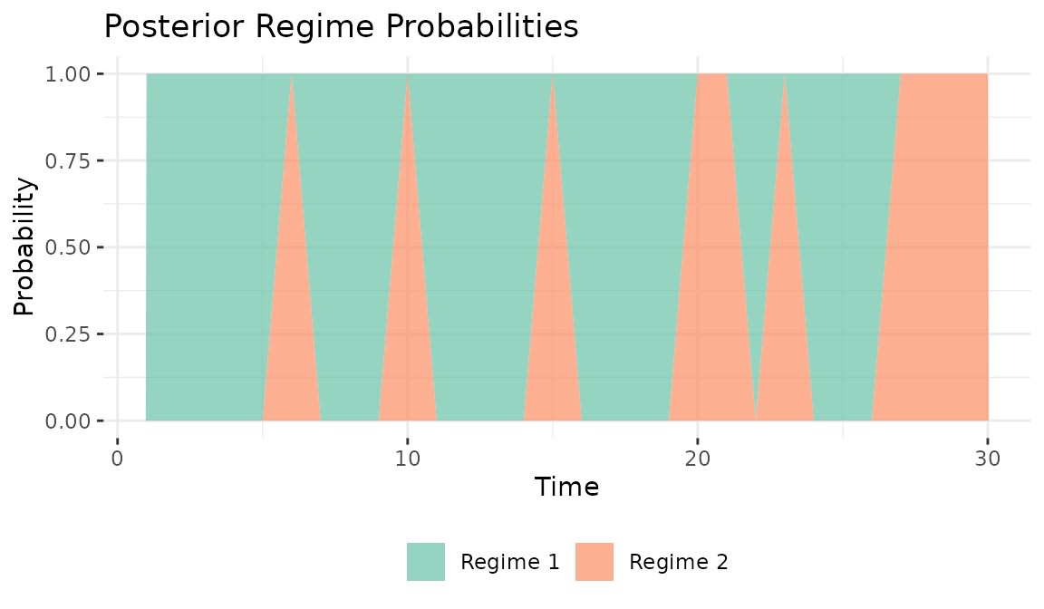 #> 12 18The true regime labels show which regime generated each time point. With two regimes and a transition probability of 0.9, we expect each regime to persist for an average of 10 consecutive periods before switching.
