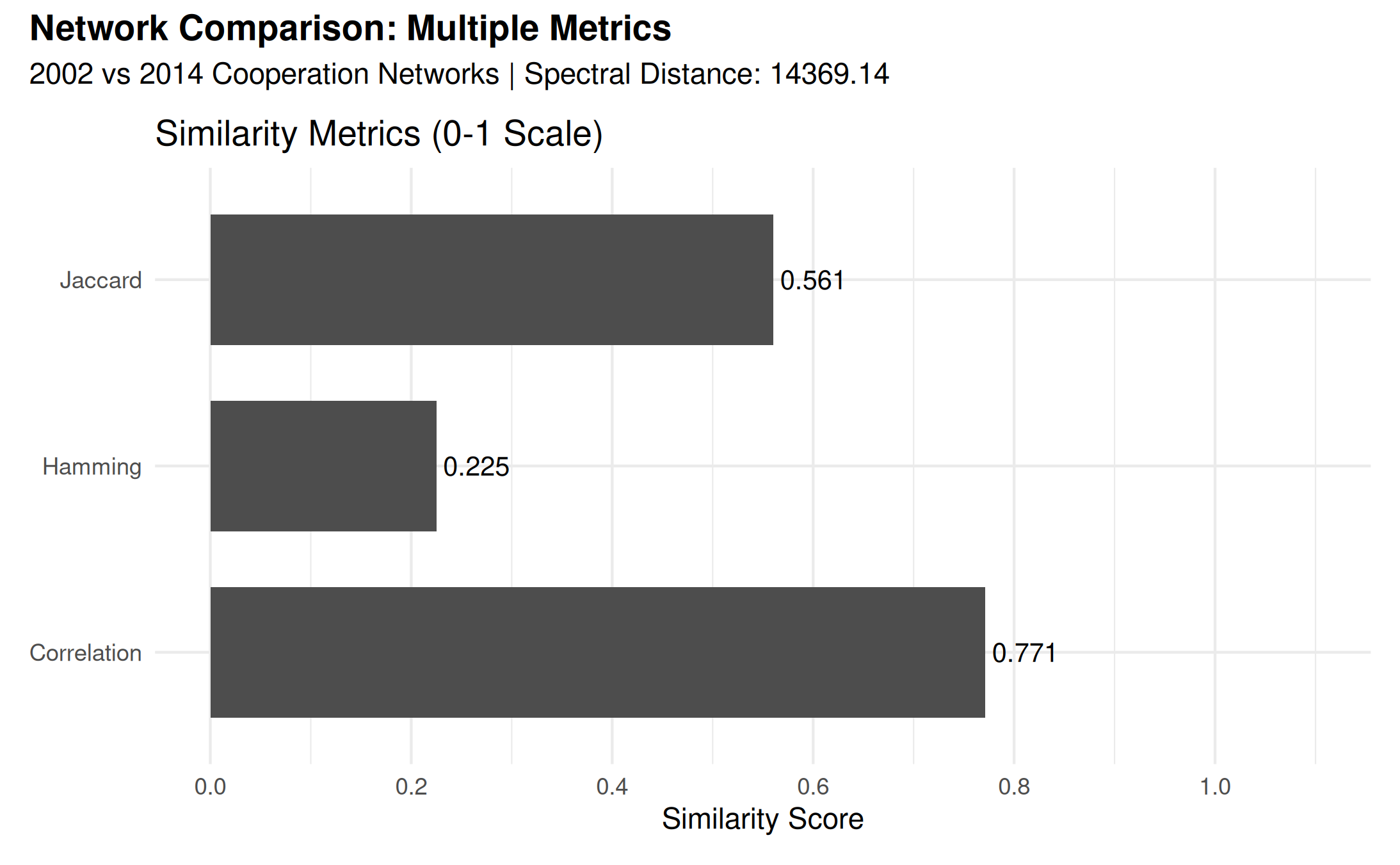 - Multi-method flexibility: Choose from correlation, Jaccard, Hamming, QAP, spectral distance, or “all”